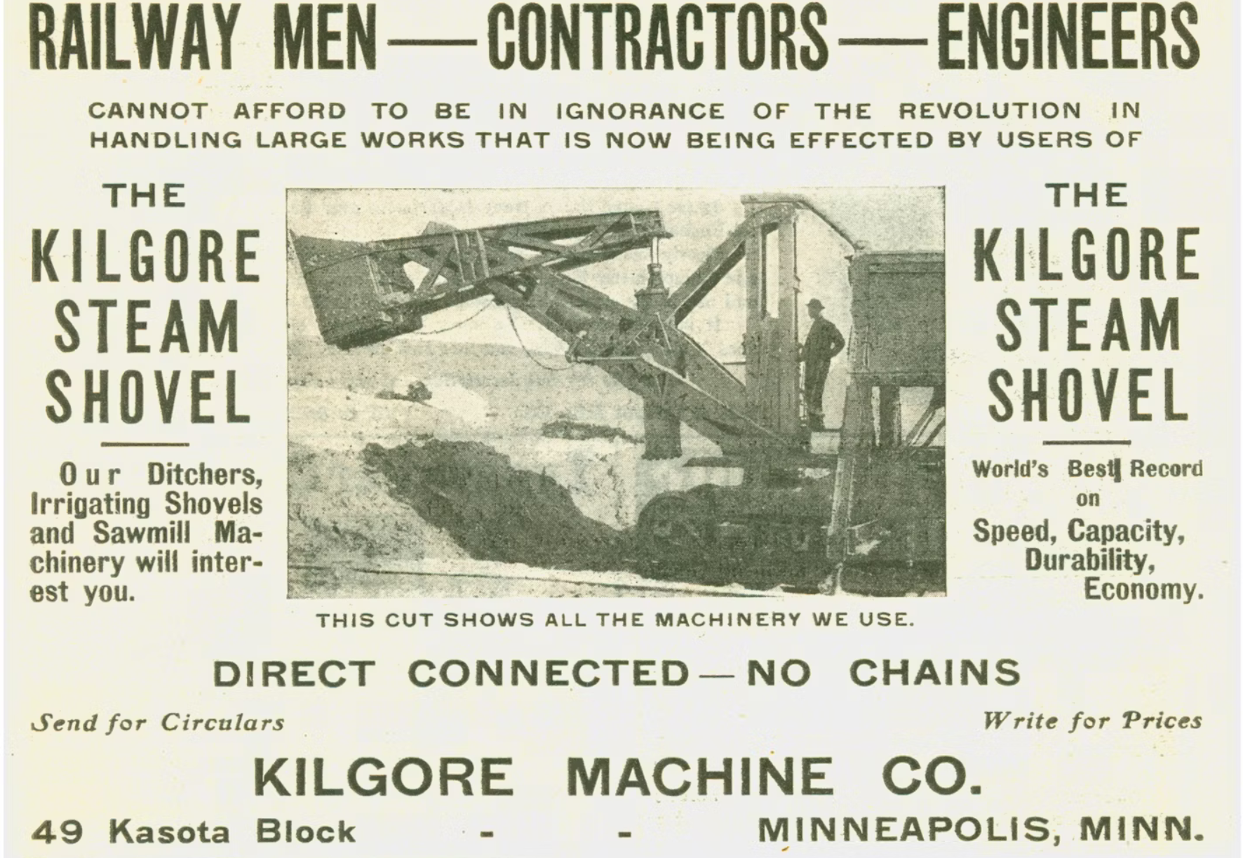 Kilgore’s Direct Acting Excavator was ahead of its time in many ways:- The machine had equal power in all movements, allowing the bucket to be withdrawn under load without having to lift it to the top to clear the cut, a major advantage over conventional shovels.