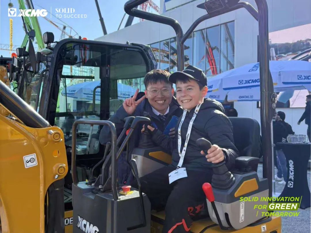 The bulk delivery of 20 electric excavators (XE215EV) marks a breakthrough in XCMG’s new energy expansion in Europe. Lined up at the exhibition were pure electric models like XE19EV, XE27EV, and XE215EV, painting the site with their signature “eco green.” At the dynamic demo area for the XE19EV, visitors eagerly jumped into the operator’s seat, creating a buzz of technological excitement.